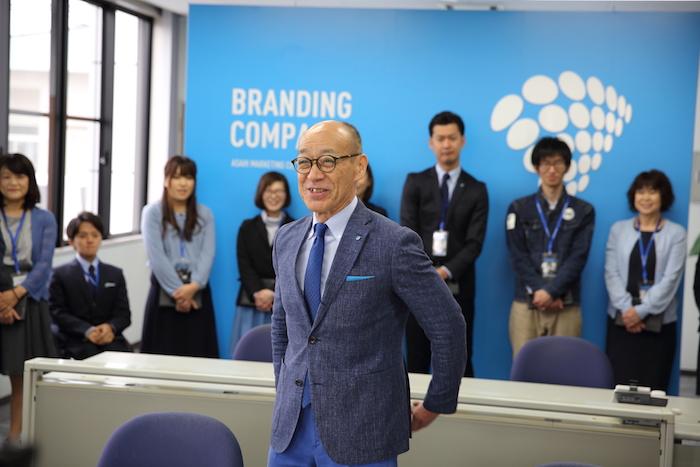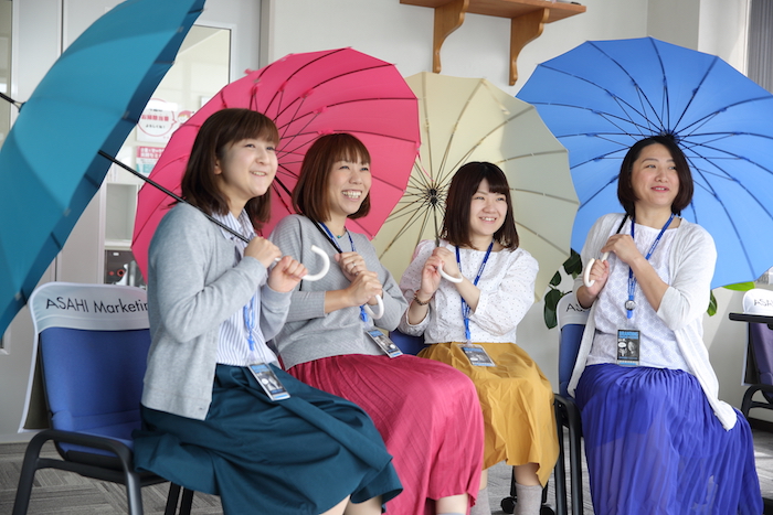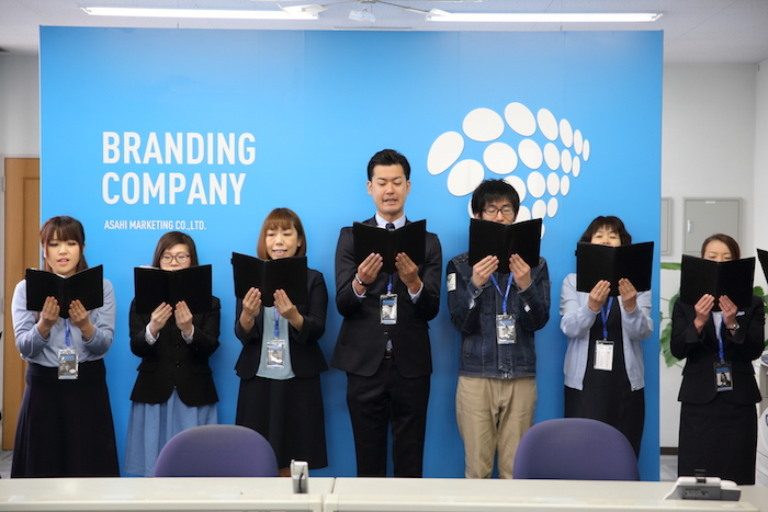社員の後ろにある青いパネルも、アサヒブルーに合わせたカラーになっています♪