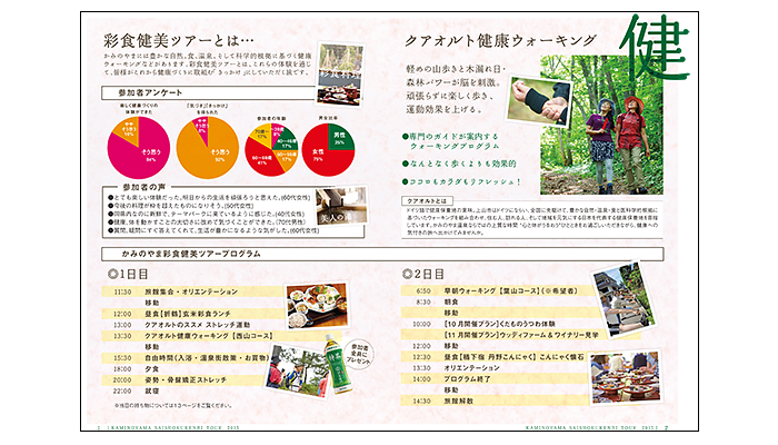 お客様との打ち合わせの中でページネーションを詰めながら、上山の発祥やクアオルトウォーキングの説明、ツアーの内容、体験者の声など、中身の濃い内容を盛り込みました。雑誌やフリーペーパー企画・発行をしている弊社ならではの強みを生かし、クオリティの高いビジュアルに。