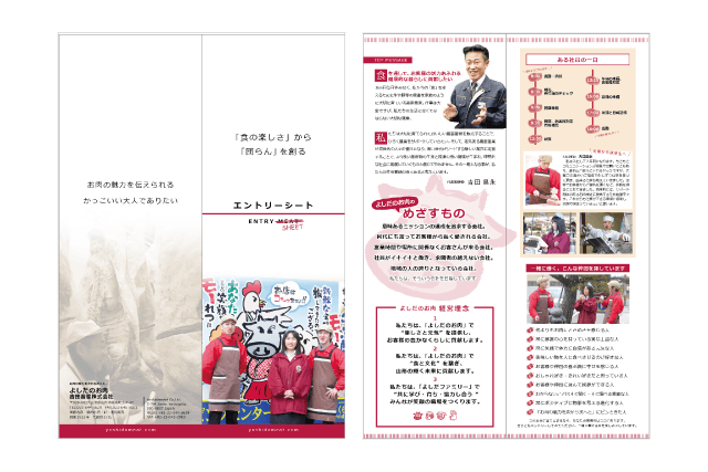 エントリーシートは、合同企業説明会に参加する時に初めて制作しました。学生向けということで、経営理念や社員の一日など、学生が興味を持ちそうな項目を考案。番号を肉のデザインにしたり、「ENTRY SHEETをENTRY MEAT」にするなど、肉屋ならではの「肉のネタ」を演出。また、若手でも役割をもって働けることを紹介するために、若い社員の写真を取り入れました。