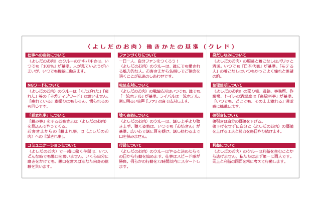 クレドの制作では、社員の意識を高めるために「12の働きかたの基準(クレド)」を立案。また、お客様への対応力や清潔感に重点をおき、クレドカードの中には「よしだのお肉 ブランドプロミス」も取り入れました。特にこだわったのが、社員のことを「クルー」という呼び方に替えたことです。クルーとは「船員」という意味。"一人一人が同じ方向を向き、仲間意識を高めてもらおう"と思いを込め、呼び方を新しく替えました。